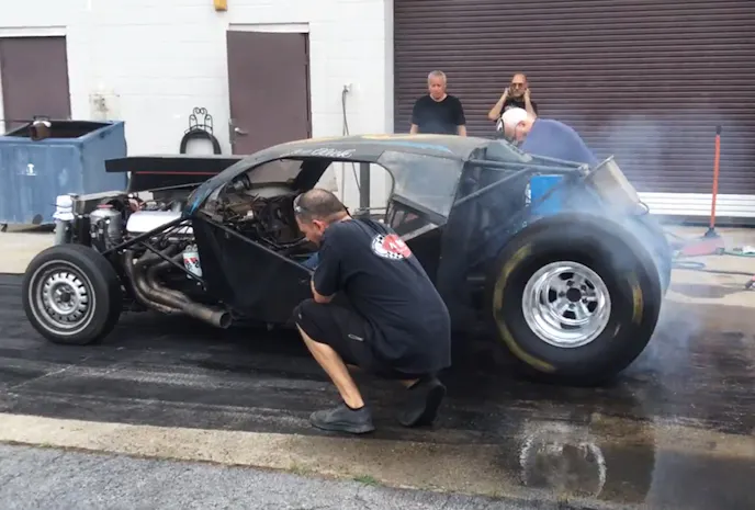 The Johnson’s “burnout car” is, as far as we can tell, an old Pro Stock chassis that’s been cobbled together with all sorts of random parts, including some donut wheels on the front, an old square-style hood scoop off one of Johnson’s old race cars, and a roof that doesn’t look like the shape of any Pro Stock body we’ve seen recently. But aside from gearing that keeps the RPM’s low (presumably so it will live through years and years of burnouts without hanging a rod out of the block), this contraption actually sounds quite potent. Whether the car is safe at speed or not is doubtful, but we’re thinking Warren’s “burnout car” could turn a number if they took it to a race track.
