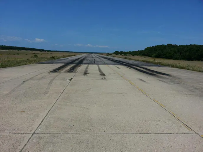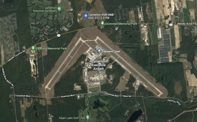 The 7,000-foot runway, the shorter of two located at the site, was formerly the Naval Weapons Industrial Reserve Plant, Calverton which was owned by the United States Navy and used to assemble, test, refit and retrofit jets built by the Grumman Corporation.