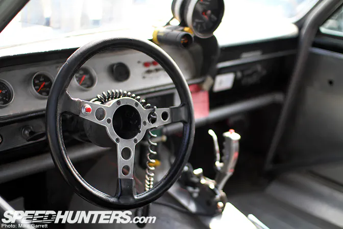 The interior shows that this poncho is all business, just a roll cage, aluminum interior, shifter, and gauges is all that you will find inside. We don’t have any other information on the car other than judging by the pictures, it has an automatic transmission with a trans brake, probably a Power glide, or turbo 400.
