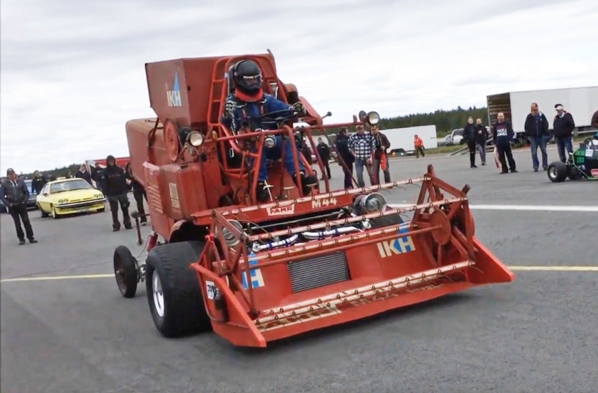 A couple of saavy Finnish gearheads, Petri Plosila and Raine Savioja, had the epically-brilliant idea to take a late-60’s era Fahr M44 combine and convert it into a purpose-built drag racing machine. Of course, anyone that’s ever been caught behind a combine on a remote country road knows these things were built for many things, and speed wasn’t really one of them. So the duo procured a 500 cubic-inch, 8.2-liter V8 engine out of a 1976-model Cadillac and shoehorned it up inside the inner workings of the classic harvester. They then mated a pair of turbochargers and an intercooler to it, all of which be seen on the combine’s exterior tucked behind the header.