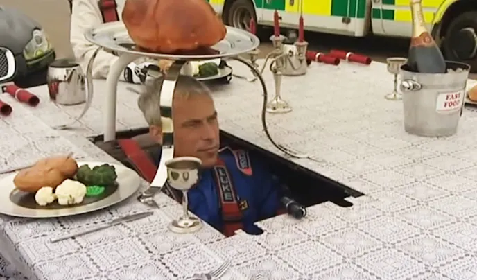 But there it is, at England’s Santa Pod Raceway, six chairs and a Queen Ann dining table, draped in a tablecloth with a full course meal, champagne bucket, silverware, candelabra, fruit, and all, turning a quarter-mile lap at over 113 MPH. In the annals of wild off-the-wall exhibition creations, this one takes the cake. No pun intended, as it doesn’t appear the cake had been served on this table yet.