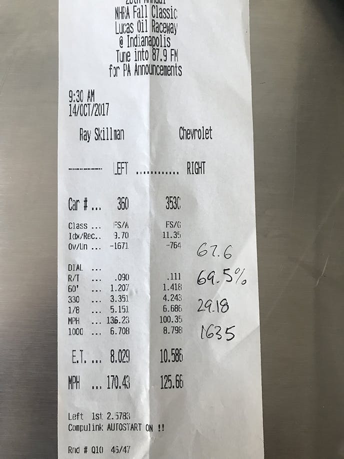 Turk shifted to Factory Stock/A for the Fall Classic in his effort to get into the sevens, allowing him to remove all of the ballast from the car, down to 3,500 pounds versus 3,550 in Factory Stock Showdown trim. The minimum weight for his combination in FS/A is 3,410, meaning he came in with one arm tied behind his back to begin with.