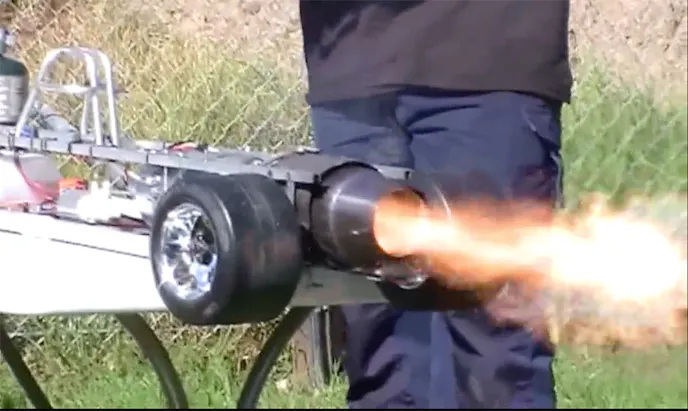 scalejetAs you can see in the videos, the car, like a real jet car, is pretty sluggish out of the gate but eventually picks up some steam and gets to rolling. As Smith points out, his driving skills weren’t quite up to par during the testing with the first one-fifth scale car, and with a twitchy steering mechanism, he wasn’t confident letting it rip. That said, the car was suggested to be capable of 60-70 mile per hour speeds on a one-fifth scale quarter-mile, which equates to 264 feet. Of course, it would likely haul some serious ass over a real quarter-mile, but such a feat would be quite difficult if not impossible to pull off, given the very nature of radio control and the lack of enough fuel onboard to run wide-open of that length of time.