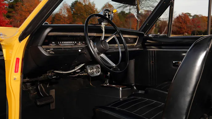 In 1977, this car was found at a car dealership in Pennsylvania by late Chrysler engineer Tom Hoover, who had played a key role in the initial HEMI engine development. Hoover tipped off Detroit’s Lou Mancini about the car, which at the time registered just 19.5 miles on the odometer. It had an amateur paint job, but was virtually unmolested otherwise. Mancini bought it with the intent to resell it, but ended up hanging onto it for a few years. During his time of ownership, he did install a Dana rearend and applied the Lemon Twist paint, and he replaced one door after needing a quick replacement on one of the Mancini Racing team cars. Then, in 1982 it was sold to a Canadian buyer. It returned to the states some years later and was stowed away as a collectors item, unraced and unaltered. Mecum’s listing notes it has been “driven only on occasional, unauthorized street jaunts since ’77,” but to this day it still shows only 3,799 miles.