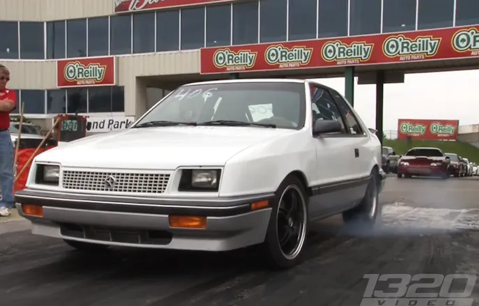 Compact cars are a double-edged sword if you’re trying to build a race car — they’re light weight and small size don’t take a whole lot of power to go fast, but the limited space to work with can limit your engine options. The majority of modern smaller cars you find in drag racing are those like the Cobalt, Cavalier and Sunfire that have been converted to rear wheel drive. The Dodge Boys Darrell Alderman and Scott Geoffrion wrecked the Pro Stock division with their small Dodge cars back in the 1990’s, and the Mopar contingent did it again years later with the Dodge Neon, but granted, those were heavily re-worked bodies meant for such a purpose. Otherwise, you don’t see too many size-deprived Chrysler products out there. But at the Street Car Takeover in Kansas City recently, the guys from 1320 Video found a 1988 Plymouth Sundance that uses a crazy mixture of parts to put down over 600 horsepower to the wheels.