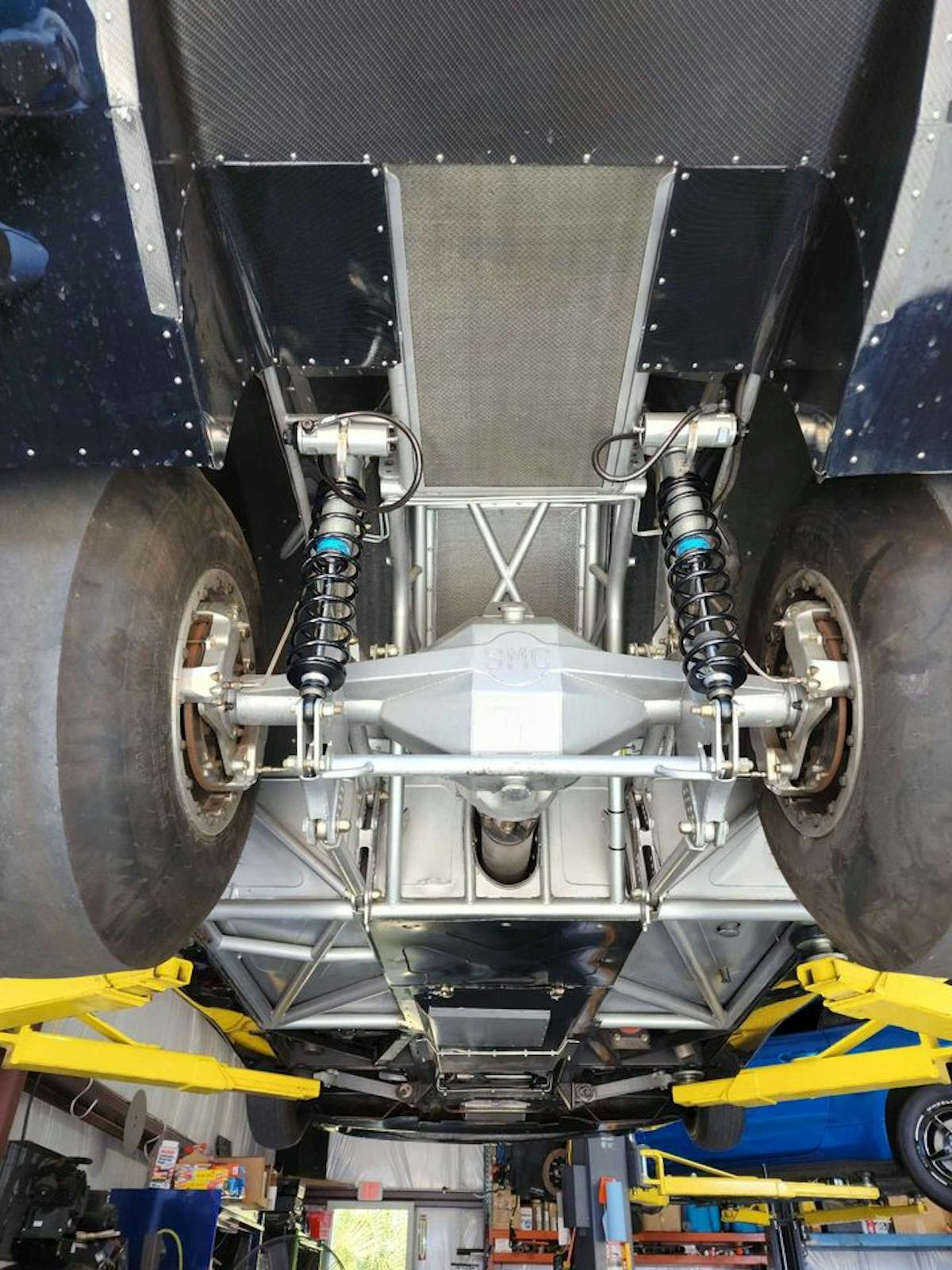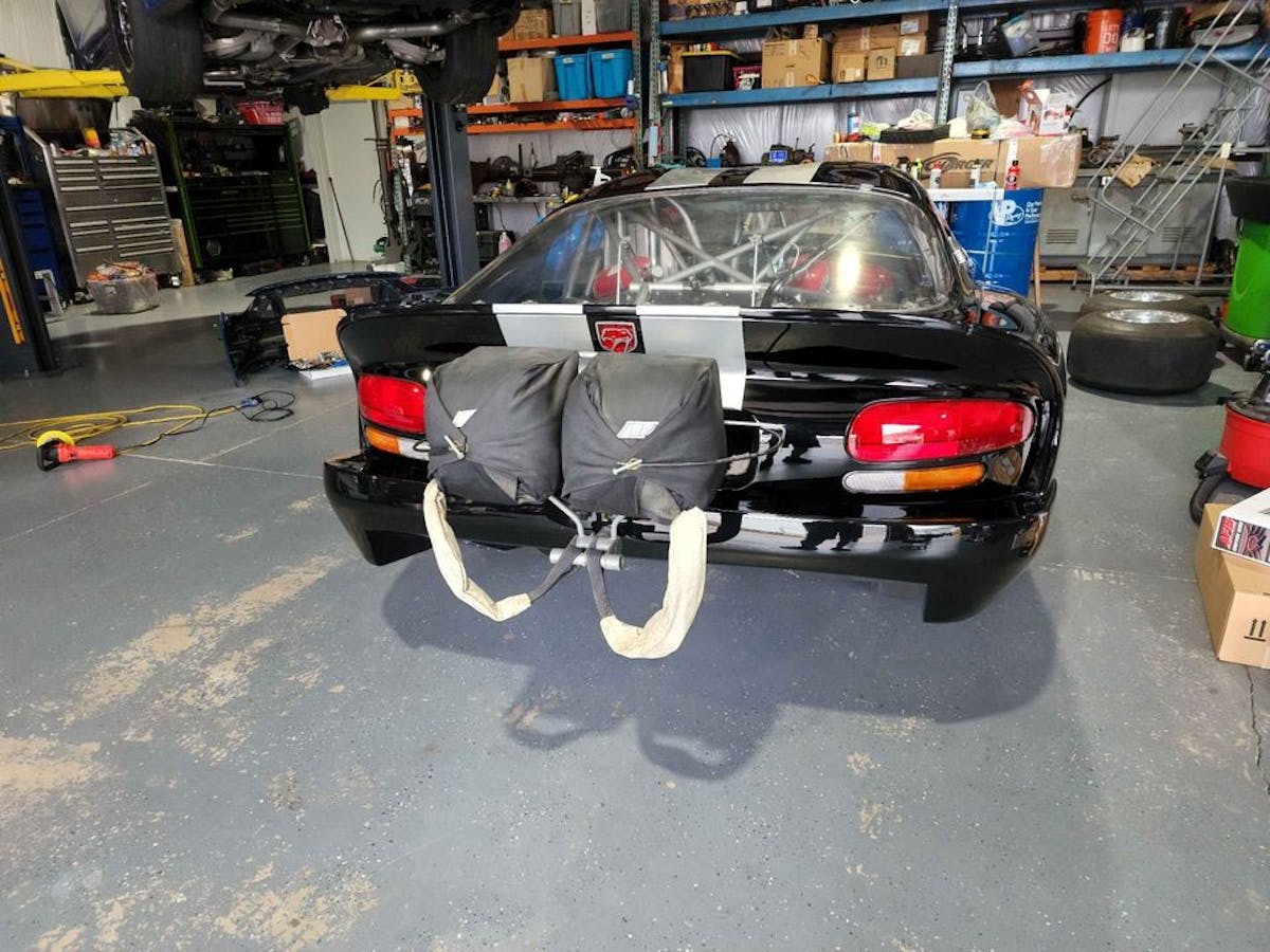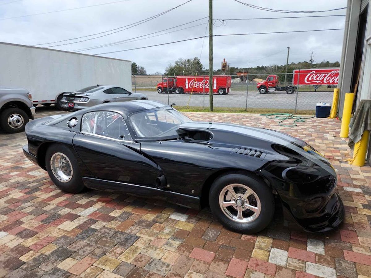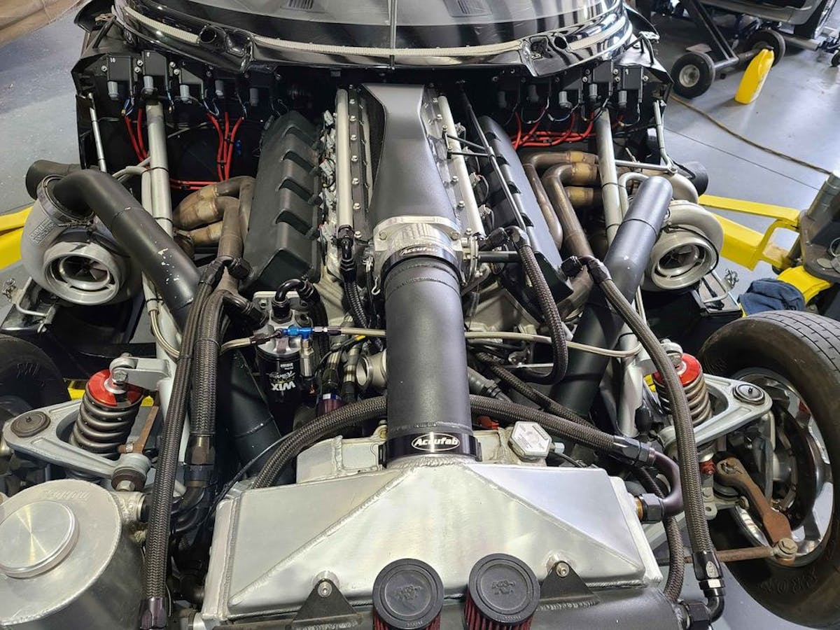 The engine, built by Kenny Duttweiler, remains true to the cars’ DNA, with a V-10 built upon a sleeved stock block. Upgraded internals, a fully built valvetrain, Striker cylinder heads, a custom John Beck intake manifold, and other top-flight parts combine with a pair of water-to-air intercooled turbos at 28 psi to produce a staggering 3,800 horsepower. A Rossler Turbo 400 transfers the power, and a MoTec M800 ECU and wiring, a Motec CDI-8 ignition, and a Davis Bump Box operate the whole thing.