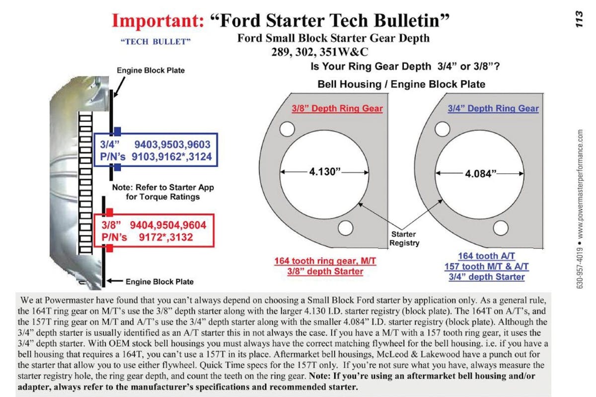 According to Donaldson, you want to measure from the starter mounting surface to the engine side of the ring gear on a Ford application. Here are a few measurements Powermaster provides to customers looking for a Ford starter.