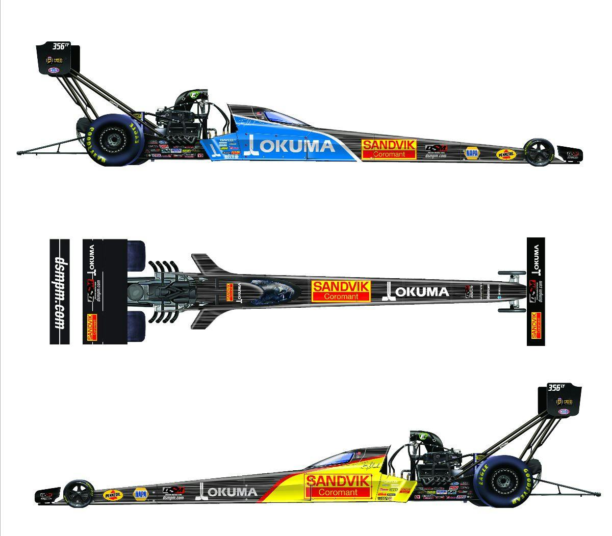 Tony Schumacher’s dragster will sport a unique ’half-and-half’ livery, with Okuma branding on one side and Sandvik on the other.