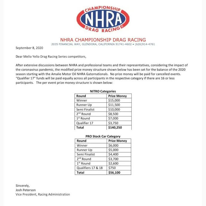 On Tuesday, the National Hot Rod Association issued a bulletin to its Mello Yello Drag Racing Series participants, outlining adjustments to its payout structure for the remainder of the abbreviated 2020 season. In what it states is in “consideration of the impact of the coronavirus pandemic”, the winner’s payouts in the nitro categories were reduced from $35,000 to $15,000 (already down from $50,000 prior to the pandemic), and subsequently, a reduction in the winnings at each rank on down the order. Pro Stock, meanwhile, was cut to $6,000 to win, and Pro Stock Motorcycle a meager $3,000.