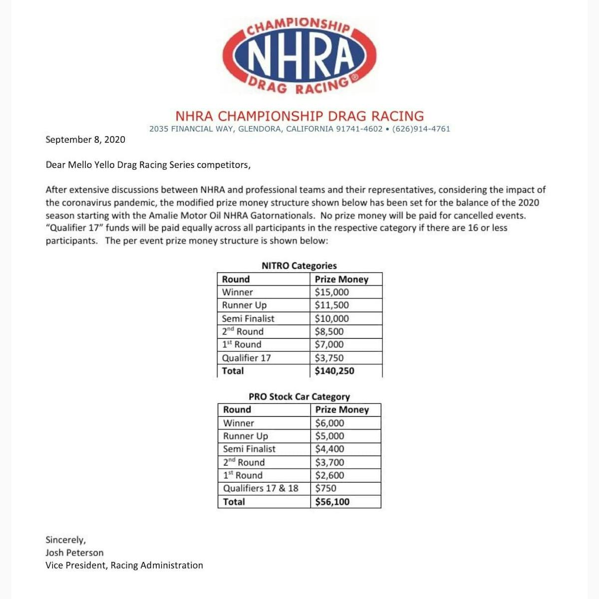 On Tuesday, the National Hot Rod Association issued a bulletin to its Mello Yello Drag Racing Series participants, outlining adjustments to its payout structure for the remainder of the abbreviated 2020 season. In what it states is in “consideration of the impact of the coronavirus pandemic”, the winner’s payouts in the nitro categories were reduced from $35,000 to $15,000 (already down from $50,000 prior to the pandemic), and subsequently, a reduction in the winnings at each rank on down the order. Pro Stock, meanwhile, was cut to $6,000 to win, and Pro Stock Motorcycle a meager $3,000.