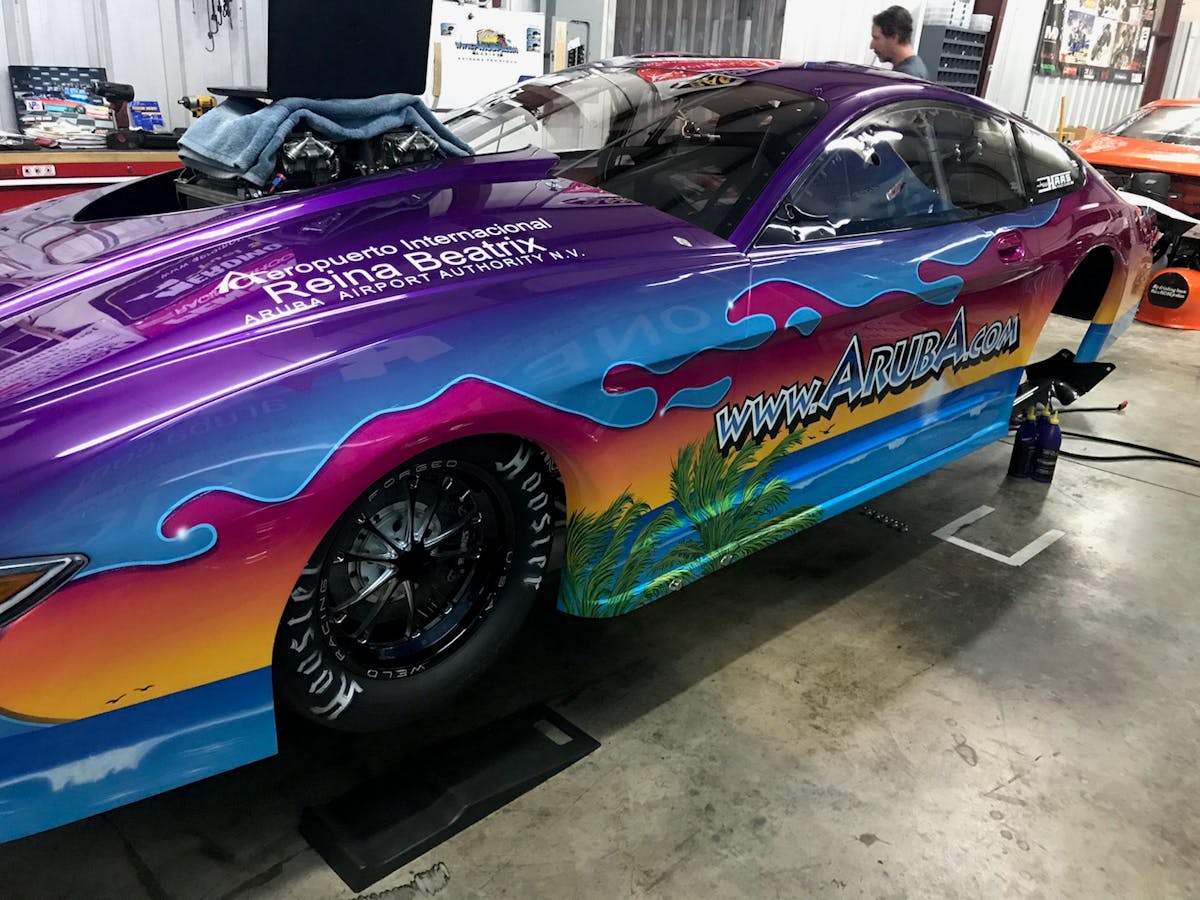 The Aruba.com Team has historically had some of the most eye-catching rides in drag racing and this Mustang is no different. It personifies the Emans’ island paradise home with vibrant colors depicting deep blue waters with palm trees set against a sunset backdrop. The car serves as a rolling billboard for a dream vacation.