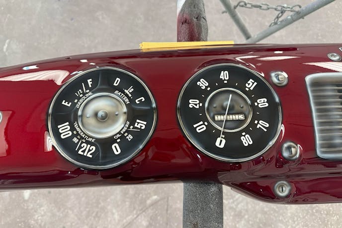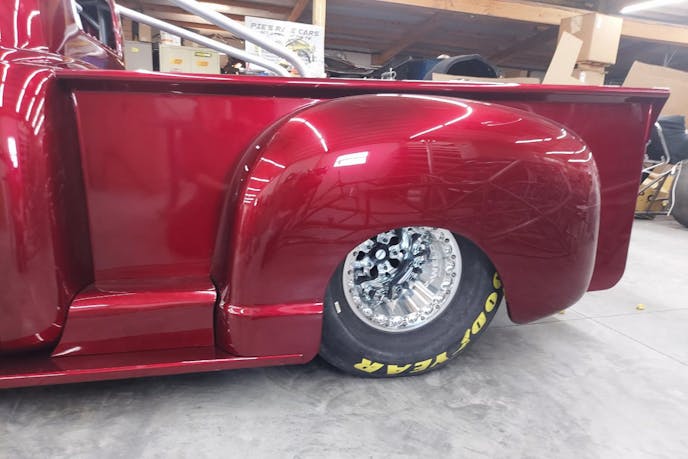 PRC Fabrication built the chassis and wrapped it in a fiberglass cab, fenders, and bed that Kuenzli sourced from a supplier. Kuenzli, dissatisfied with the weight of the fiberglass nose and factory grille combination, built his own mold and crafted a carbon-fiber front end that weighs just 12 pounds. A full carbon-fiber belly pan also spans the complete length and width of the underside of the truck.