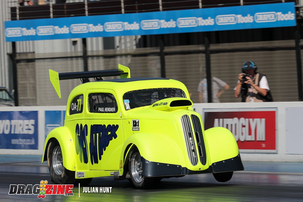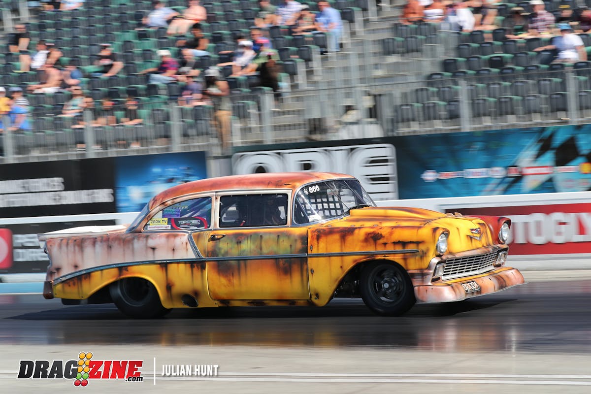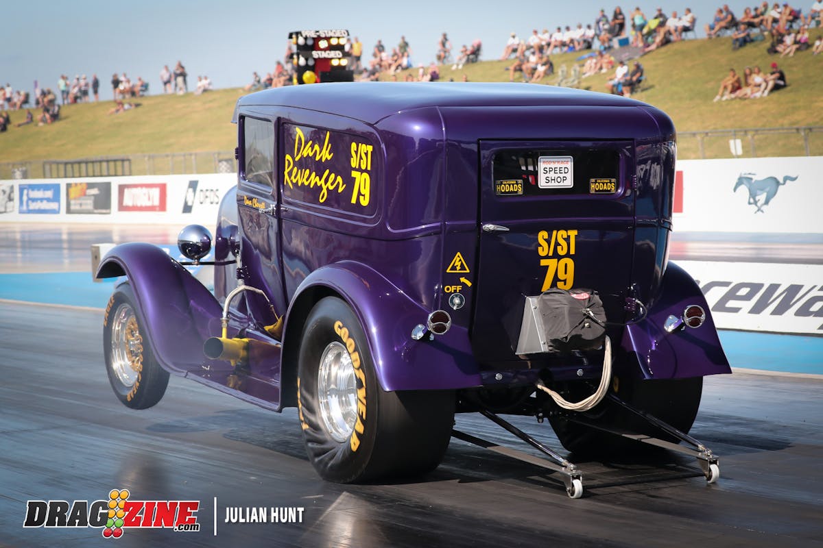 Due to rain delays on Friday, there were only three qualifying runs in Pro Mod. Ålund drove Magnus Petersson’s The Old 51 Chevrolet Business Coupe to the Number One qualifying spot, but it wasn’t pretty. Ålund only made it to the finish line twice, and just once under full power.