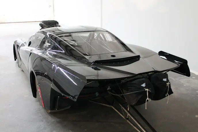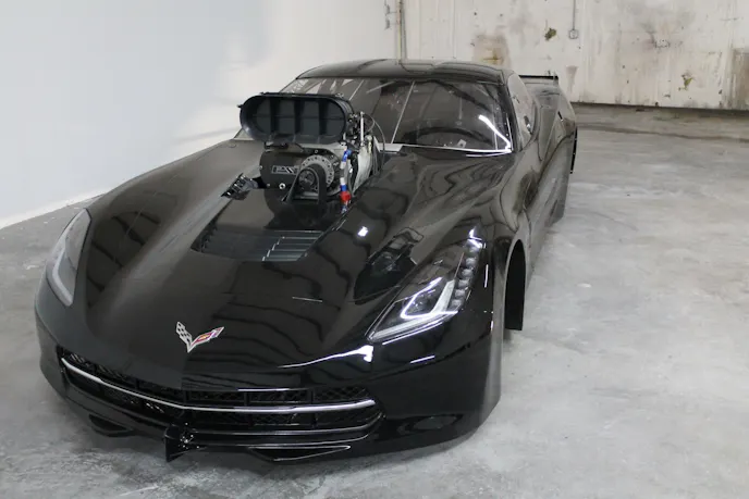 The famed Outlaw 10.5 racer is stepping up once again with a 2014 Chevrolet Corvette being turned into the most innovative 10.5 car in the pits for the upcoming season. The new C7 body style is arguably one of the sleekest, most aerodynamic designs to date from the minds at Chevrolet. The innovative crew at Vanishing Point Race Cars took an all-factory body, straight from Chevrolet, and built this masterpiece for Mobley. VPRC has many diligent hours into the mounting process for the body, including three full days for each individual door in modifying it for weight and Lexan purposes.