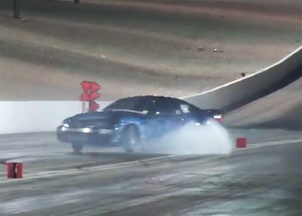As he fought to keep the momentum rolling while straddling the centerline, Yee’s machine finally snapped and took a hard right turn right at the concrete guardrail. Instinctively, he pulled the car sharply back to the left and then right once again, setting off a spectacular two-and-a-half loop spin in the middle of the race track in what can only be described as the drag racing version of an Olympic figure skating performance. To the crowd’s applause and complete dismay, Yee got the Mustang shut down just before it could nose into the wall in the lane it began in.