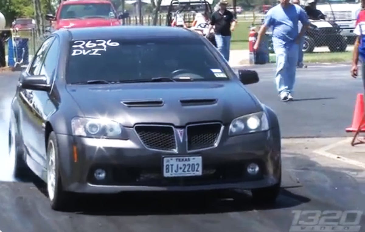 The G8 in this video is not your standard grocery getter. This car, according to the owner, is sporting a stock motor being fed some boosted air from a ProCharger. Making a stout 700 horses at the wheels on only 10 pounds of boost, the car had been a best of 11.16 in the quarter mile on soft wall drag radials. What makes this car even better is the fact it’s a street car with a baby seat in it. The problem is that on the car’s last pass the motor decided it didn’t like how it was being treated. As you see the car blast into the traps a whole bunch of white smoke pours out, and that’s never a good sign. The driver had entered the world of “race car problems” and windowed the block, but on the bright side, she did win some money.