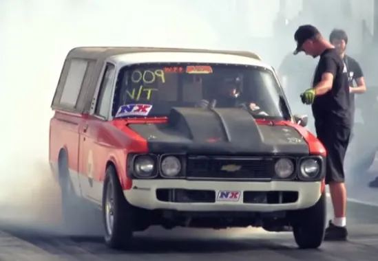 The real Farm Truck and Mini Farm Truck both have a great sleeper vibe about them until the tree drops and the action starts. On the first pass in this great video you can see just how hard the Mini Farm Truck leaves as it gets a bit out of shape and still runs a 9.27. On the second pass the truck leaves straight and makes a clocks-off pass, going 141 mph out the back door.