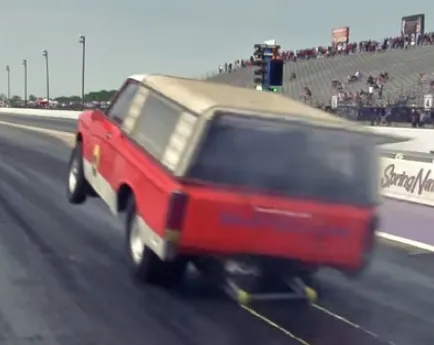 There’s no doubt that the hit TV show Street Outlaws has given drag racing a healthy shot in the arm when it comes to popularity. When the stars of the show make an appearance at a track or event they pack the house, and now have started to inspire tribute race cars. Skull Crusher Adventures caught the tribute truck “Mini Farm Truck” at the 2015 Houston Performance Trucks Shootout that pays homage to the wheel standing star of Street Outlaws.