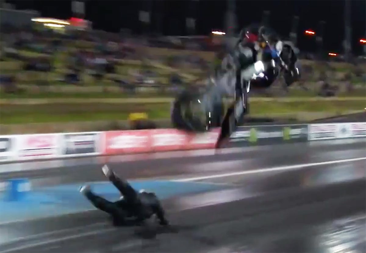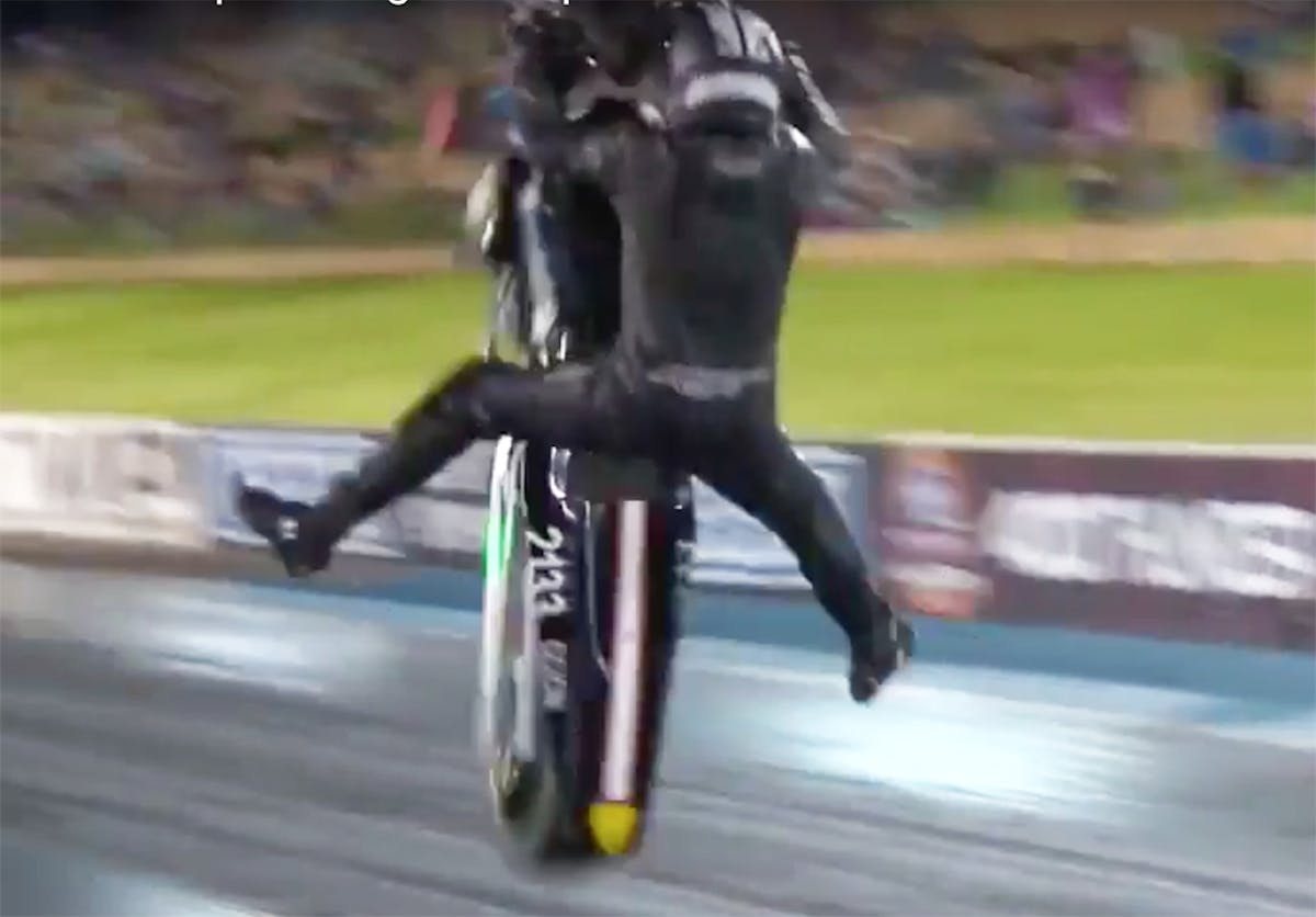 Ghadini’s 7.7-second motorcycle hardly made a full revolution of the rear tire before it went skyward, and with the throttle cracked, the bike pirouetted and threw Ghadini from the saddle before he could even react. Ghadini landed on his knees and slid on his nose, while the bike crashed hard to the ground.