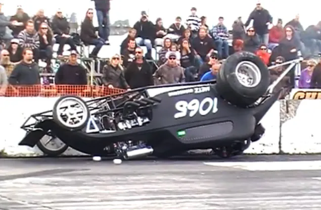 The short wheel base and sheer power of the engines in these Altereds always have a way of putting on a show. Metz was not injured in this accident, and we’re sure that he’ll be back out there soon.