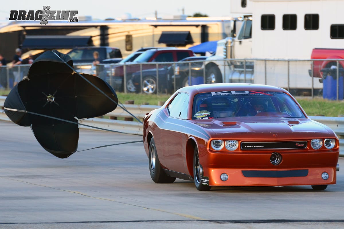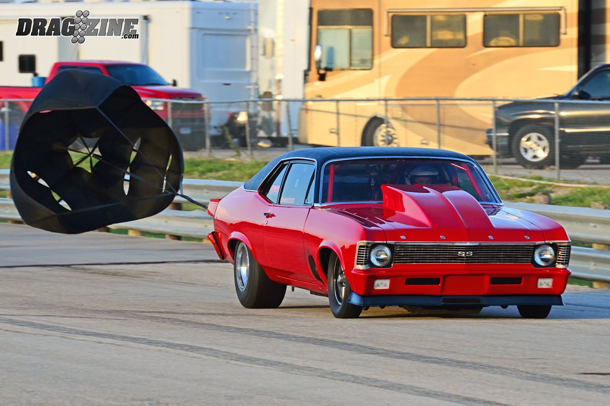 In the first incident shown below, the car clicks off a pass of right around 6.00-seconds — making it roughly a low nine-second car — and the driver quickly gets the parachutes out, but the combination of hard braking and the necessity of turning right eats him up, sending the car sliding out of control, into the wall nose-first, and over onto its roof.