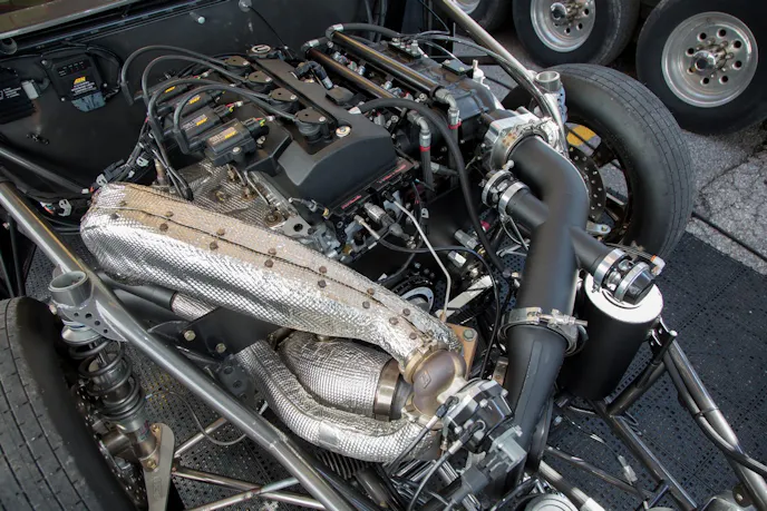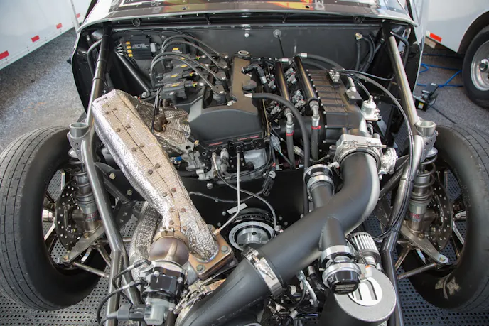 With that solid foundation, Bales added a stock-block F20C InlinePRO built Honda powerplant that only measures 2.0 liters. Inside the motor are some top secret rotating parts that can stand up to his high-RPM clutch dumps from the G-force transmission. Monitoring and controlling the small displacement rocket is a full AEM Infinity system. In full NHRA Competition Eliminator DD/AT trim, the Honda ripped off an impressive 6.948 elapsed time at 197 mph with just a 76mm turbo providing boost last weekend at the NMRA/NMCA Super Bowl in Chicago while making test hits in Top Sportsman.