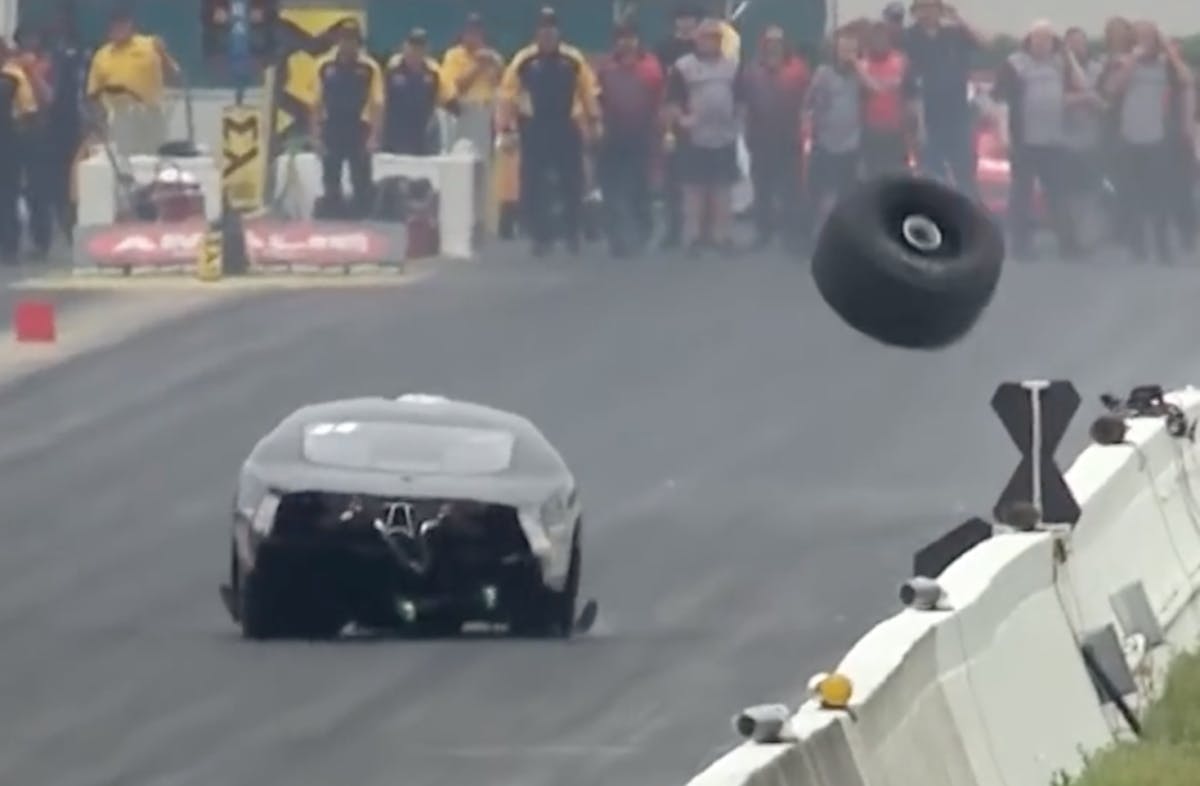 During Saturday’s third session of Pro Modified qualifying, New York’s Mike Castellana launched his Al Anabi Performance Camaro into severe tire shake, which appeared to have sheared the wheel studs off the right rear wheel, sending him spinning around and into the opposing guardrail. Fortunately for Castellana, the low-speed point at which the incident occurred minimized the damage to the car as it side-slapped the wall and chucked the rear wheel out of the wheel-well. Castellana, as you might expect, bowed out of competition for the remainder of the weekend. He was, at the time, unqualified with a 9.62-second best, good for only 28th on the sheet after two sessions.