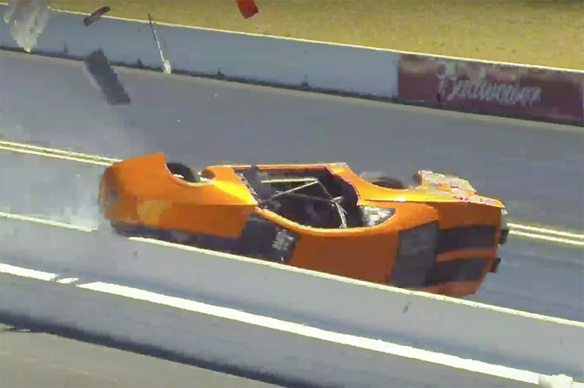 Warter, in his D/SM entry running on an 8.94 index, took more than a full second handicap, before Giroux gave chase. The Canadian gave up only a slight edge on the tree and was running his opponent down when he began to drift out of the groove near the wall around half track. Once the tires got out in the marbles, the Camaro turned hard right across the centerline onto its roof and struck the opposing wall nose-first. From there, as the video shows, Giroux slid on his roof well into the shutdown area, where the car slowly tumbled to a stop.