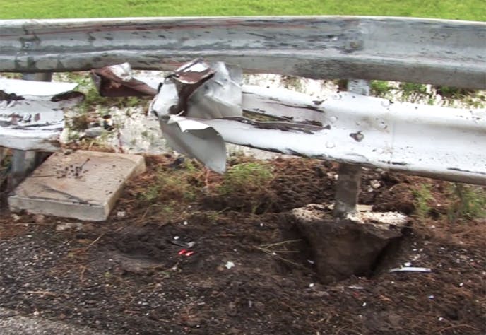 The Firebird briefly caught fire after coming to rest, but was quickly extinguished as Mitchell climbed from the battered car. Videographer Sean Melton of Urban Hillbilly Videos captured the aftermath of the accident, showing the extensive damage to the Jerry Bickel Race Cars-built Pontiac and to the track itself: the impact knocked the concrete footers for the railing out of the ground and tore a small section of the steel like a tin can. The wheelie bars and other parts of the car can also be seen stuck in the guardrail — evidence of a battle in which both fighters landed a few direct blows.
