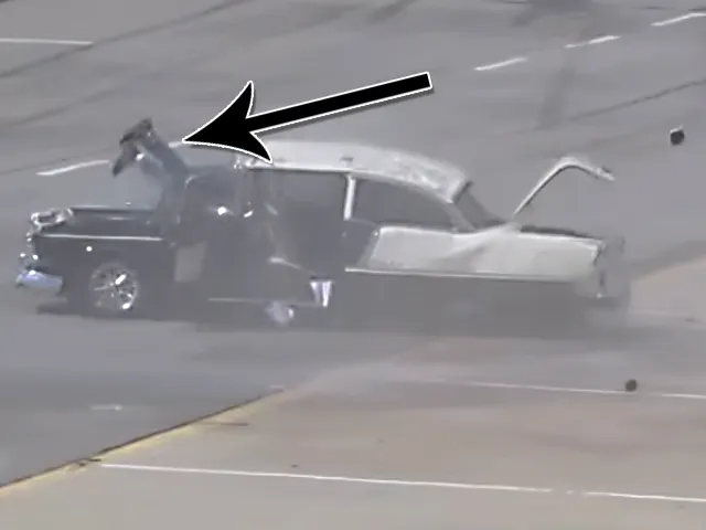 Said Fifty-Five, being driven by Kelly Harvey, appears to launch a bit more conservatively, but once he rolls hard into the throttle a second or two into the race, he also finds his gorgeous ride fighting to stay stuck to the racing surface. There’s some speculation in the comments (language/trolling warning, as this is YouTube after all) that the driver of the ’55 got into trouble because he steered away from the slip-sliding Camaro, and that certainly may have been the case as the F-Body does make a hard move toward the centerline as the ’55 begins to lose control.