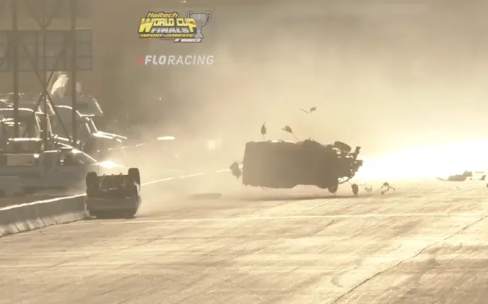 X275 versus Hot Rod competitors Bill Colson and David Farlow were uninjured in a frightening high-speed, two-car crash during qualifying at the Import vs Domestic World Cup Finals at the Maryland International Raceway on Friday. Driving their respective Fox body Mustangs, the pair were charging side-by-side to the 1/4-mile stripe in the third session of qualifying when Farlow’s machine took an abrupt turn across the centerline, striking the right rear of Colson’s machine and sending them both into tumbling out of control. Fortunately, both drivers emerged from their battered machines without serious injury.