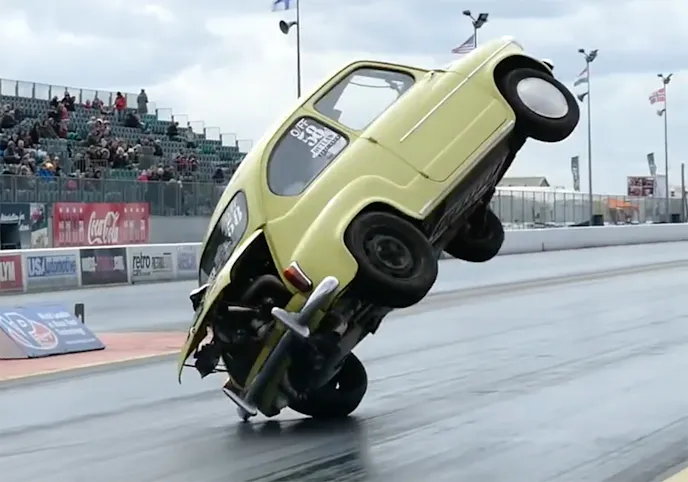 European racer Dave Nicholls was taking part in the Santa Pod Raceway’s annual Big Bang VW festival behind the wheel of his Fiat 600 this past weekend, clicking off some 11-second runs during the course of the event, culminating with a best run of 10.96 in the 1/4-mile. The street-driven car runs in the Outlaw Flat Four class with a 1914cc turbocharged powerplant, and gets it done on radial street tires.