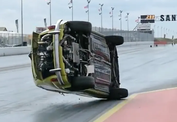 But Nicholls’ weekend came to a crashing halt — literally — on this run, when the car got far too much bite than he anticipated, as the little Fiat, at just 78 inches of wheelbase, instantly climbed skyward at the drop of the clutch. Before Nicholls could even react, the car was already up on one wheel, then none, and was pirouetting in mid-air….crashing down hard on the drivers side and tapping the guardrail with its underbelly