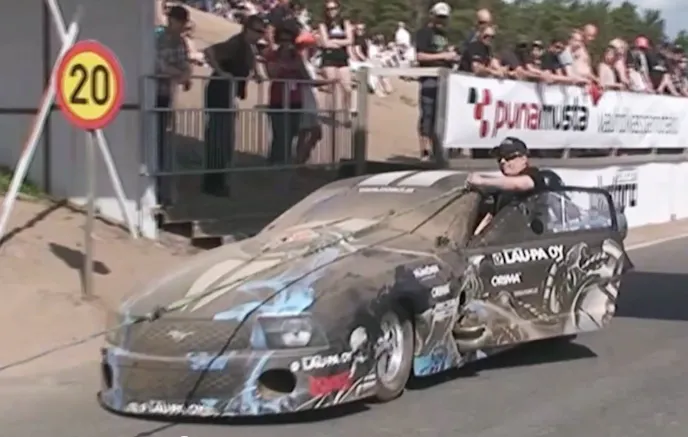 Laukkanen, who himself hails from Finland, had just completed a 6.09-second, 408 km/h (253 mph) winning elimination pass in his twin-turbocharged Ford Mustang when the parachutes ripped off the car, leaving Laukkanen with nothing but the brakes and lady luck to bring him to a stop. By way of some impressive driving, Laukkanen was able to swing the car around in the sand and bring it to a safe stop. But most impressively, the car didn’t turn over, nor did it display any signs of damage…not even a cracked or damaged carbon fiber nose.
