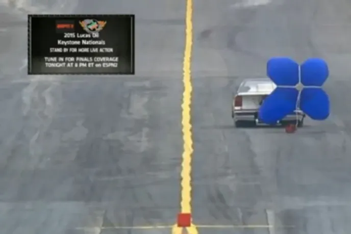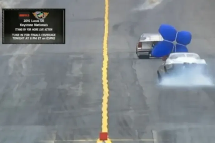 Our clip opens to a pair of Competition Eliminator cars on the track at Maple Grove Raceway at the 2015 NHRA Keystone Nationals. In the left lane, an Oldsmobile Cutlass launches downtrack, while the blown ’63 Corvette in the right line seems to stall out on the starting line. As the Cutlass suddenly swaps lanes as he passes the eighth-mile mark, the Corvette roars to life and begins a seemingly leisurely trip toward the finish line. However, as the ‘Vette begins to approach the top end, we can see that the Cutlass is still in his lane and shows no intention of returning to the left lane.