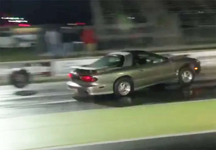 From the transmission and the driveshaft to the pinion, axles, and wheel studs…everything else in the drivetrain has to be upgraded correspondingly to the power and torque, at the very least. Failure to do so is simply asking for the worst. Of course, the worst, in most cases, is the very scene you witness in this video by Hans Pierre Jr. of Free Life Films from the No Guts No Glory grudge race a week ago in Orlando, in which the wheel studs sheer off the drivers side of a Pontiac Trans Am just off the starting line, nearly sending it careening into the concrete barrier.
