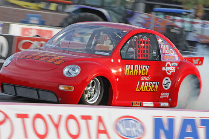 The Bug was built by Harvey’s race team partner and sponsor, Jim Larsen of JCL Racecars, and relies on a true Volkswagen engine that displaces 155 cubic inches. 155 cubic inches, and it runs 7.80’s!
