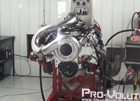 The mill that Morris has on the dyno here features a Dart cast iron block, outfitted with 14.5-degree Big Chief-style cylinder heads and a wet sump oiling system, topped with a 123mm throttle body in a blow-through configuration from the supercharger, burning methanol and utilizing a BigStuff3 fuel injection, twin Precision 550 lb/hr fuel injectors,, and a pair of Weldon fuel regulators. A unique attribute, as Morris points out, Jones has had a stainless steel supercharger blow-through pipe fabricated that transitions from 4-inches to 5-inches at the throttle body, as well.