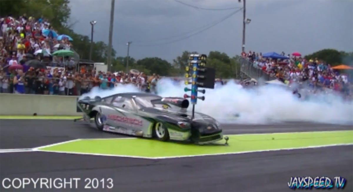 The sport of drag racing is inherently dangerous. From the fuels used to power the cars to the speeds achieved at the top of the quarter mile, there is danger lurking all around. Nitrous bottles exploding, wheels flying off due to a broken axle, driveshafts turning into pretzels – all of these things can take place during a typical day at the dragstrip. What’s not typical is a car going out of control during the burnout process and making its best attempt to knock the Christmas tree over. Unfortunately for Pro Modified racer Isiah Rojas, that’s exactly what happened to him this past weekend at the DragMania Music & Drag Racing Festival at Orlando Speedworld Dragway.