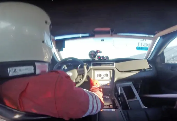 Behind the wheel of his stick-shifted, supercharged 5.4L ’12 model Cobra Jet packing a Liberty 4-speed and backed by Liberty Gears and Varsity Ford, Ronzello motored to an 8.94 to put a leg up on the record. Because an official backup is required in order to set a national record, Ronzello had to put together another run within 1%, and the 8.97-second run you see here from onboard his Mustang is the run that sealed his name into the record book.