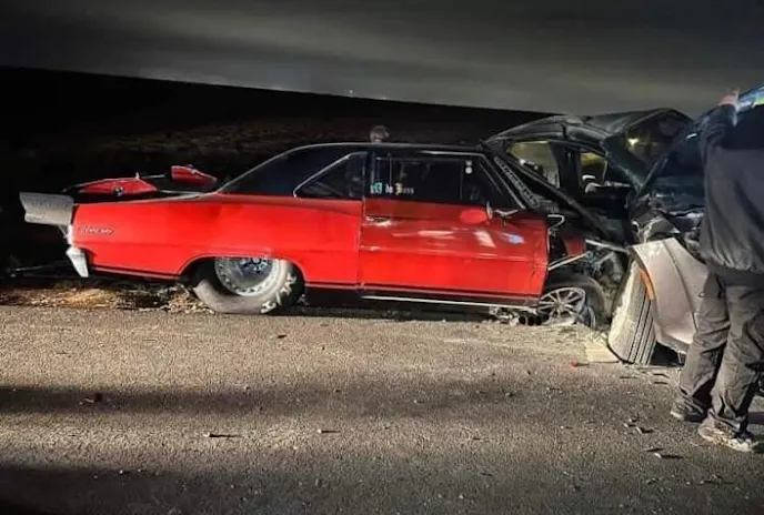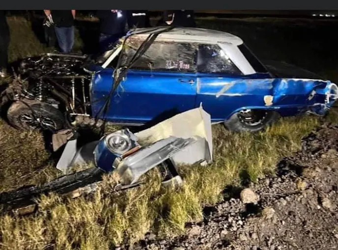 Occurring in early January at a location in south Texas, JJ and Tricia were matched up in their familiar Chevy II’s — JJ in ”Hummingbird” and Tricia in “ZipTie” — and Tricia had just taken the win in a tight race when, according to JJ, a blow-off tube or oil line came loose, igniting a fire and sending his car careening into the corner of his wife’s at high speed. The contact sent Hummingbird one way, tumbling into the ditch, while Tricia turned the other way and took the more serious impact, striking a production vehicle parked off to the side of the road well beyond the finish line.