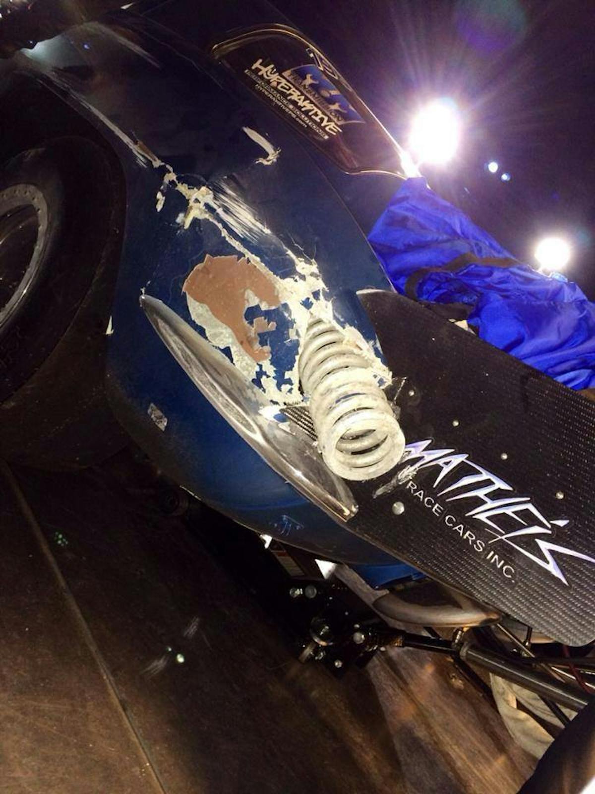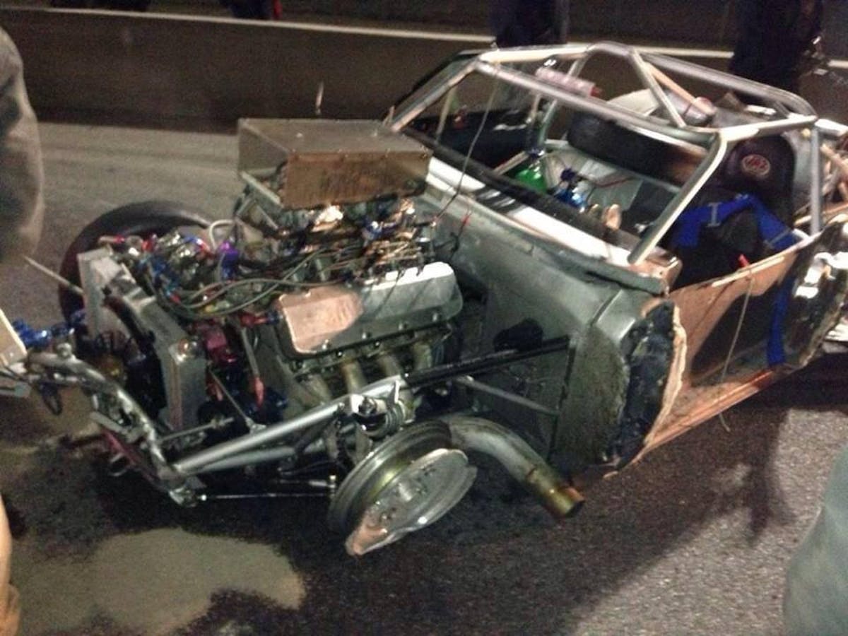 Our friend Hans Pierre Jr. of Free Life Films was on hand and shared some photos with us of the remains of both cars, showing the destruction that each endured. The violent impact mangled the front of Woodruff’s beautiful machine, while the body was completely torn — sans one of the doors — from Bynes’ Camaro, leaving it virtually destroyed. And as you can see in the photo here, strange things happen in incidents like this, with the coilover shock penetrating the quarter panel of the Corvette illustrating that point.