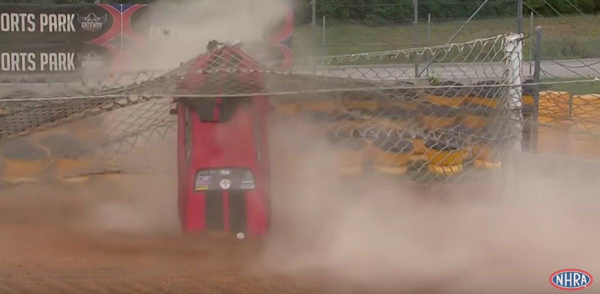 Mike Bowman was on the outside looking in on the qualifying sheets of the quickest Pro Mod field ever at the NHRA AAA Insurance Midwest Nationals, so he decided to dial up the biggest tune-up he had to make the show. Things really didn’t go according to plan for Bowman, and making the show was the least of his worries as his parachutes didn’t open and he barreled into the sand trap at Gateway Motorsports Park.