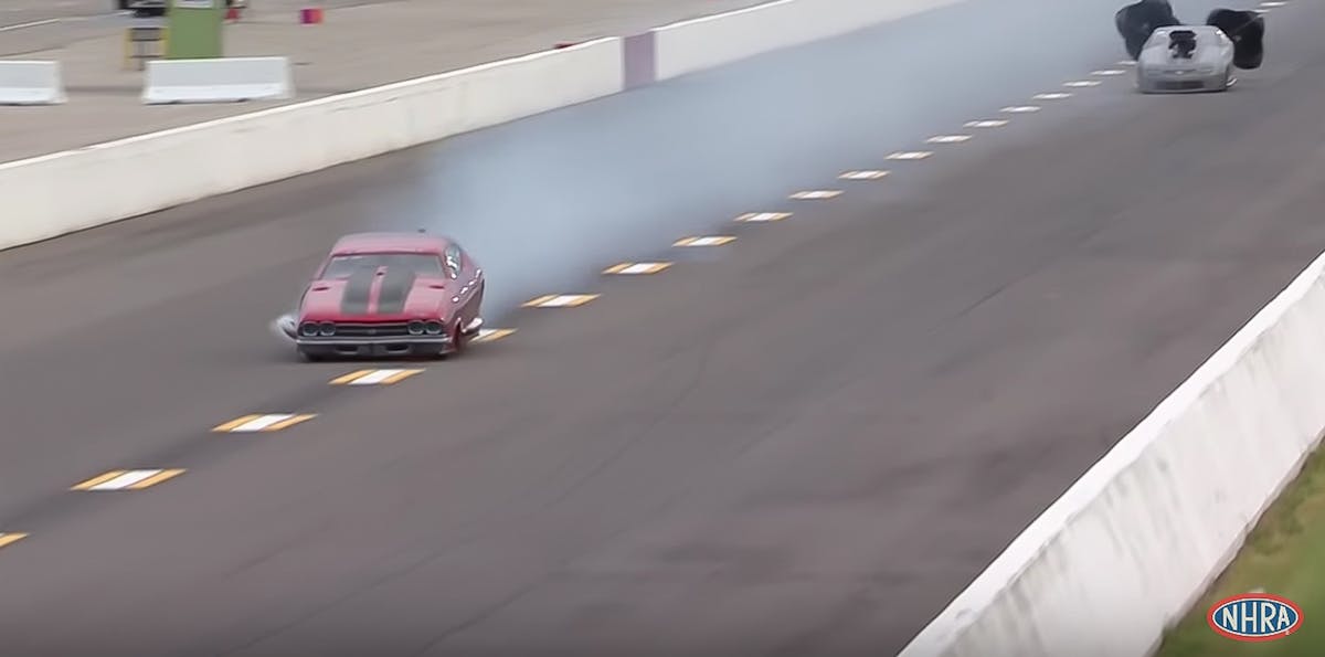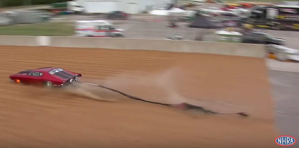In this video from the NHRA, you can see Bowman’s car racing towards the sand trap at terminal velocity as his brakes are in full meltdown due to the high rate of speed the car is moving at. Bowman showed his veteran driver prowess and centered the car up going into the sand knowing that would improve his chances of a favorable outcome. The Chevelle skidded through the sand and ended up in the net standing straight up on the bumper. Thankfully, Bowman wasn’t seriously injured in this wild chain of events.