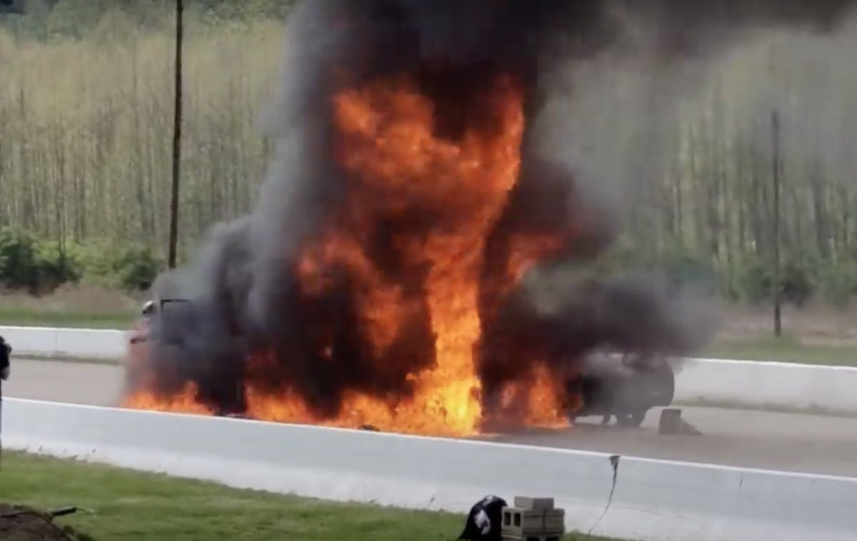 A private no-prep event held at an Ohio dragstrip turned sour on Saturday when a a well-known racing machine impacted the guardrail and caught fire, resulting in its complete destruction and leaving its driver with minor burns to his hands.