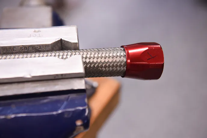 Raczuk begins by inserting the nut into the appropriate size Koul Tool and then placing the tool into a vise. Once the tool is firmly clamped, insert the hose into the tool and push firmly while rotating the hose. Using the Koul Tool prevents the stainless steel braided hose from binding and funnels the hose directly into the nut; preventing the frayed end of the hose from doing any damage or resisting.