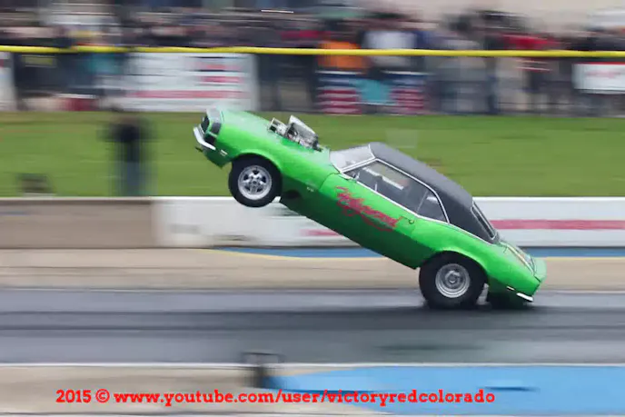 Newman's second and final pass, all four tires off the ground and then a hard landing with more front suspension damage and sparks flying out from the undercarriage of the Chevrolet Camaro.