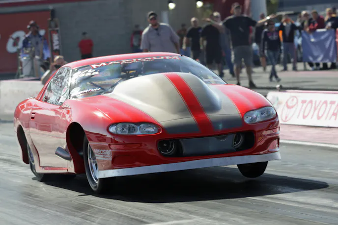 The launch resulted in a strong 1.06 short time, but just after the wheels touched down past the 60-foot mark, the car kicked the tires out and Agostino went for a wild ride. Despite trying to hang on, the car got into the marbles and Agostino ended up in the far wall nose-first, spun around, and back into the wall with the driver’s door before finally coasting to a stop further down the track.