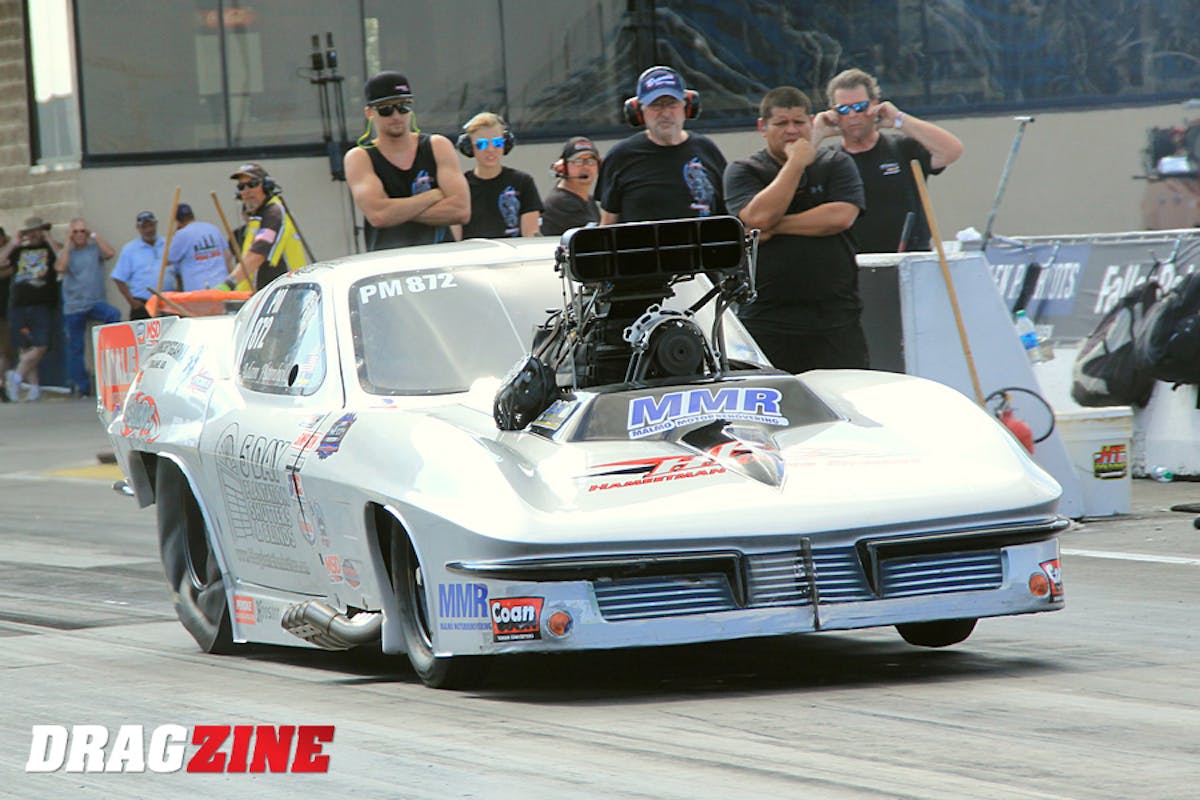 Flamholc, the incoming points leader in the NMCA’s Xtreme Pro Mod eliminator, had qualified number one in his ’63 Corvette in a series record field of 28 cars with a 3.80, earning him a first round date with Mark Wells’ turbocharged Camaro. After the tree dropped, Flamholc’s machine made a move toward the wall at around the 250 foot mark, forcing him to get on and off the loud-pedal several times in an effort to tiptoe it to the round win. Just beyond the eighth-mile finish stripe, the car pitched abruptly toward the right wall, forcing Flamholc take an evasive maneuver, ultimately overcorrecting back across the track — in front of Wells, who thankfully had shut the car off early in the run — and into the left lane guardrail at upwards of 150 mph.