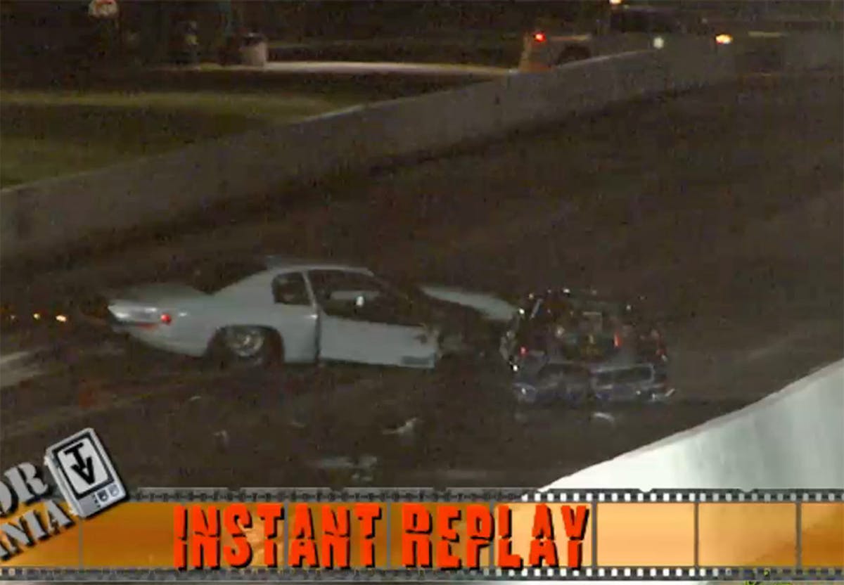 Futch, meanwhile, was still at the starting line building boost and didn’t move until seconds after Commisso did. Once he did, however, his Monte Carlo also a move to the centerline, but he couldn’t corral it and slipped across the centerline, where he plowed into the back of the slowing Commisso at a pretty high rate of speed. The impact sent Commisso nose-first into the right hand guardrail, while Futch’s car spun around — nearly flipping over onto its roof — before finally coming to rest just before the quarter-mile clocks.